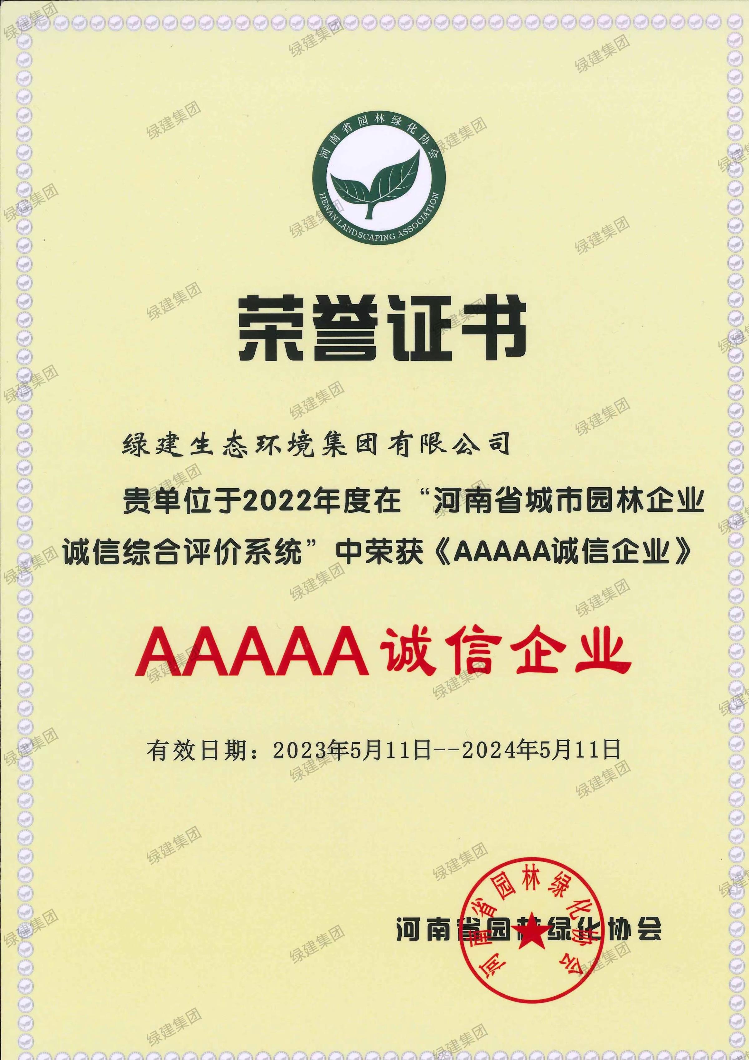 河南省園林綠化協(xié)會5A證書2023.5-2024.5